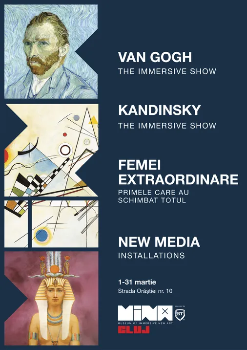 Bucură-te de întreaga experientă MINA Museum: trei spectacole imersive de excepție: Vincent van Gogh și Wassily Kandinsky și Femei extraordinare: Primele care au schimbat totul.